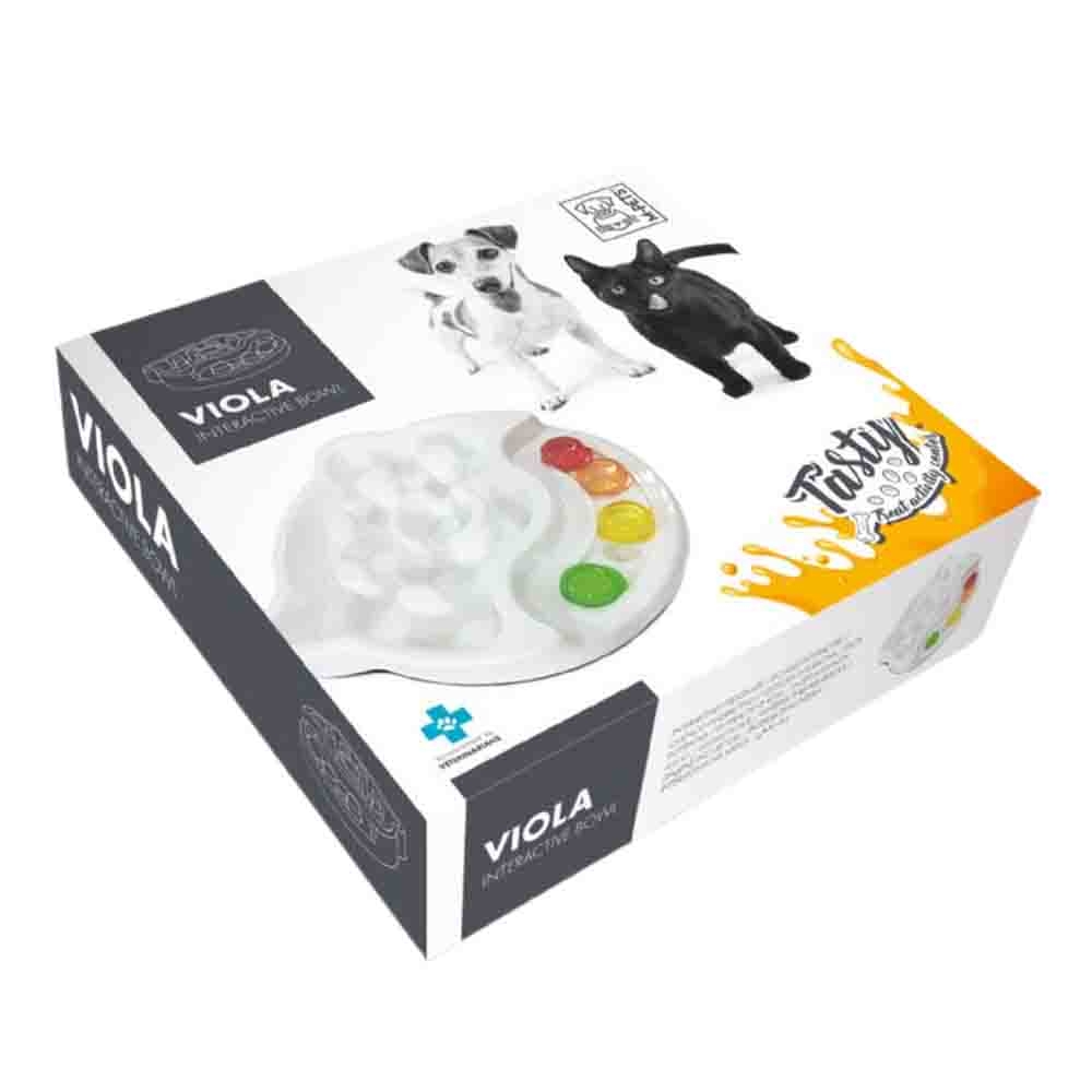 M-pets tasty viola interaktif mama kabı; Kedi ve köpeklerin yavaş yemesini sağlayacak özellikte üretilmiştir. Kaymaz tabanlıdır. Mama kabı; Bulaşık makinesinde yıkanabilir.