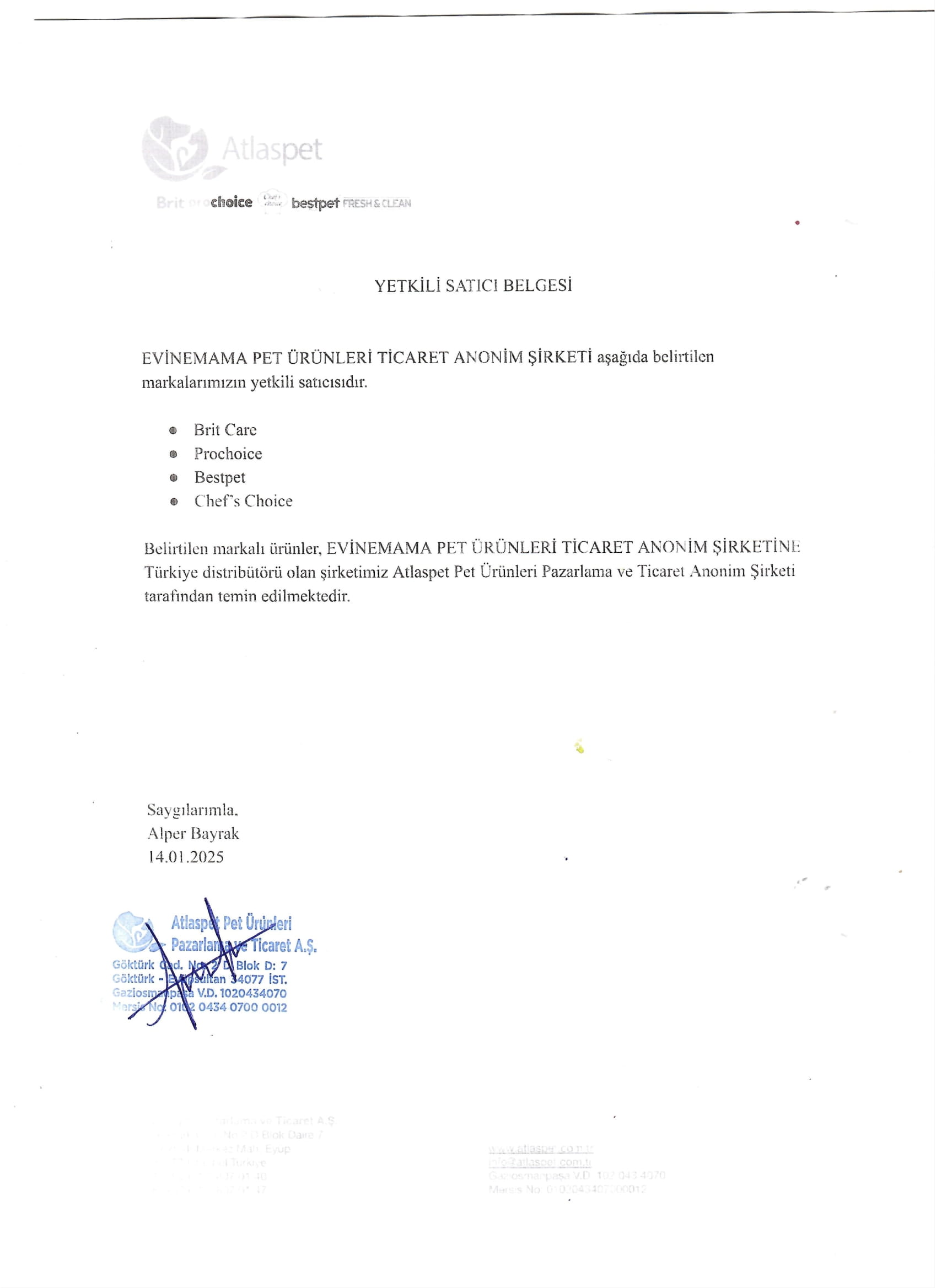 Evinemama, BRIT marka ürünlerin yetkili satıcısıdır ve satışını yaptığı tüm ürünleri Atlas Pet Ürünleri Pazarlama ve Ticaret A.Ş. firmasından tedarik eder.