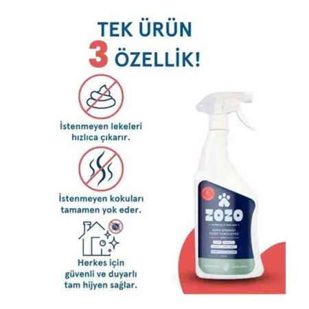 Zozo hipoalerjenik evcil hayvan koku ve leke giderici sprey; Tüm yüzeylere uygun organik içerikte üretilmiştir. Ortamda bulunan istenmeyen kokuları engeller ve kokuların giderilmesine yardımcı olur. Leke giderici sprey; İnsan ve hayvan sağlığı açısından uygundur. Bu ürünler hayvanlar üzerinde test edilmemiştir. Zozo ürünleri; Veteriner hekimler tarafından özel olarak geliştirilmiştir. Evcil hayvan koku ve leke giderici sprey; Klor, alkol, paraben, sülfat, parfüm, sles, sls, silikon, amonyak, boya, sentetik yağ, fosfat, zararlı kimyasallar içermemektedir.