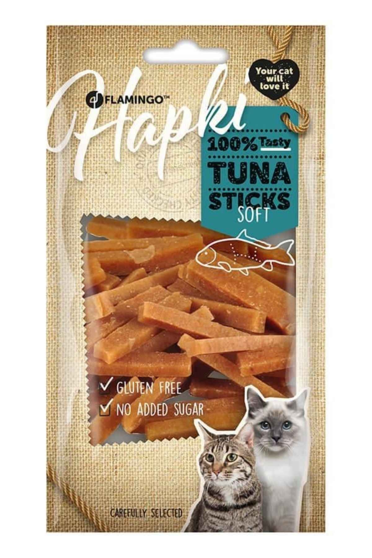 Flamingo Hapki Tuna Balıklı Çubuk Ödül Maması; Kediler için tamamlayıcı lezzetli ödül mamasıdır. İçeriğinde ton balığı bulunan şerit şeklinde mamadır. Kedi ödülü; Glüten ve şeker içermez. Yüksek protein, düşük yağ oranına sahiptir.