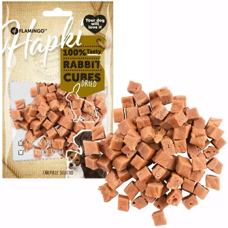 Flamingo hapki tavşan etli küp şeklinde köpek ödül maması; Köpekler için özel olarak üretilmiştir. Köpek ödülü; Her ırk köpek için uygundur. Şeker ve glüten içermez. Protein oranı yüksek yağ oranı düşük olarak formüle edilmiştir.