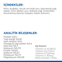 Mısır, buğday, tavuk ve hindi unu, hayvansal yağ, dijest, mısır glüten unu, bitkisel yağ, mineraller, kurutulmuş pancar posası, keten tohumu.