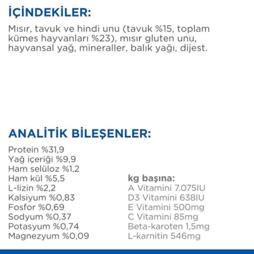 Mısır, Tavuk ve Hindi Unu (Tavuk %15, Toplam Kümes Hayvanları %23), Mısır Glüten Unu, Hayvansal Yağ, Mineraller, Balık Yağı, Dijest