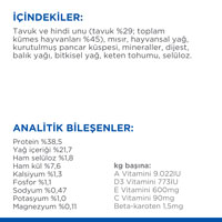 Tavuk ve Hindi Unu %45 (Tavuk Eti %29), Mısır, Hayvansal Yağ, Kurutulmuş Pancar Küspesi, Mineraller, Hidrolize Protein, Balık Yağı, Bitkisel Yağ, Keten Tohumu, Selüloz