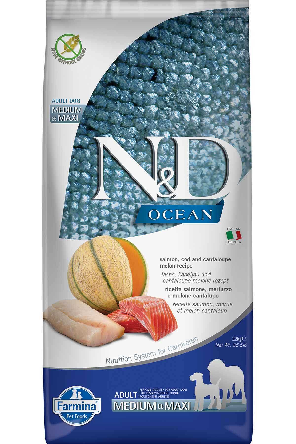 ND Ocean Tahılsız Somon Morina Balığı ve Kavunlu Büyük ve Orta Irk Yetişkin Köpek Maması 12kg
