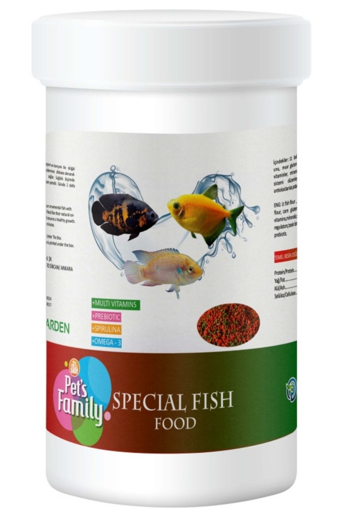 Akvaryum dünyasının renkli sakinleri için eksiksiz ve dengeli bir beslenme deneyimi! Pets Family Special Fish Food, süs balıklarınızın tüm besinsel ihtiyaçlarını karşılamak üzere özel olarak formüle edilmiş bir tam balık yemi ürünüdür. İçeriğindeki yüksek kaliteli LT balık unu, omega-3 balık yağı ve krill unu sayesinde balıklarınızın enerji seviyelerini yükseltirken, canlı ve parlak renklerin korunmasına yardımcı olur. Japon balığından tropikal türlere kadar pek çok akvaryum balığı için uygun olan bu özel formüllü yem, su canlılarınızın çok daha sağlıklı gelişmesine katkı sağlar.