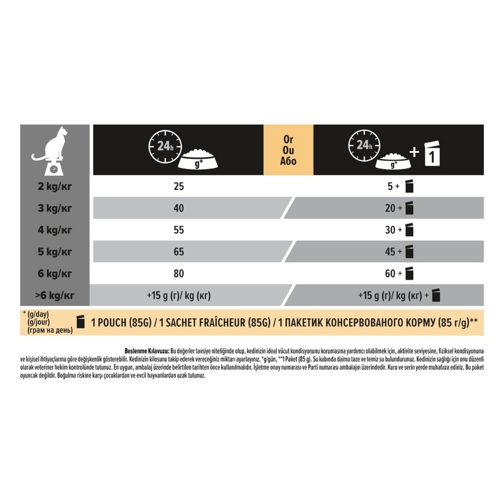 Vücut Ağırlığı (kg) Sadece Kuru Mama (gr/gün) Kuru Mama + 1 Pouch (85g)* 2 kg 25 g 5 g + 1 Paket 3 kg 40 g 20 g + 1 Paket 4 kg 55 g 30 g + 1 Paket 5 kg 65 g 45 g + 1 Paket 6 kg 80 g 60 g + 1 Paket 6 kg Üzeri Her kg için +15 g ekleyiniz Her kg için +15 g + 1 Paket * Karma beslenme (Mix Feeding) değerleri, 85g'lık Pro Plan Pouch (Poşet) yaş mama baz alınarak hesaplanmıştır. Kedinizin aktivite seviyesine ve fiziksel kondisyonuna göre miktarları ayarlayınız. Su kabında daima taze ve temiz su bulundurunuz.