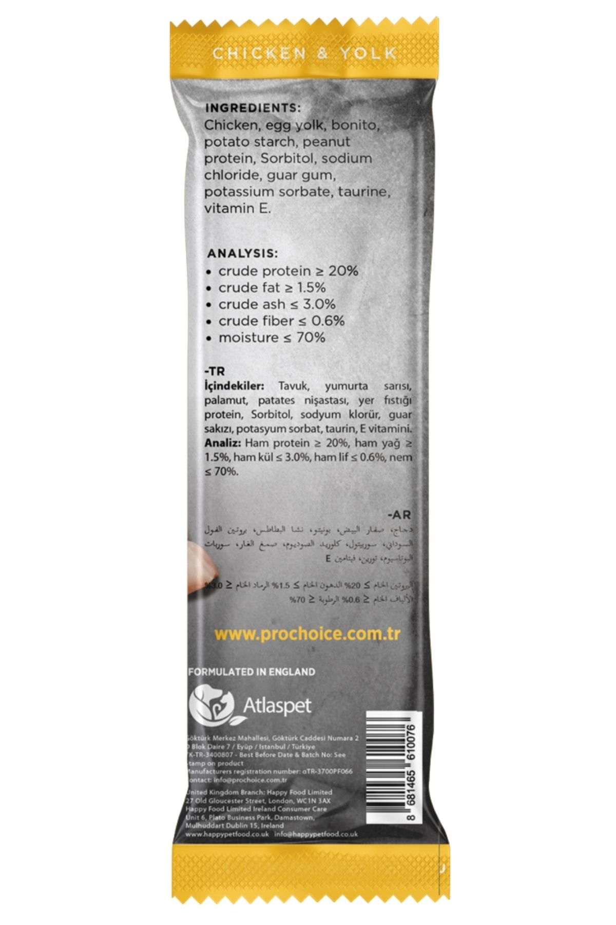 Tavuk, yumurta sarısı,palamut, patates nişastası, yer fıstığı, protein, sorbitol, sodyum klorür, guar sakızı, potasyum sorbat, taurin, e vitamini