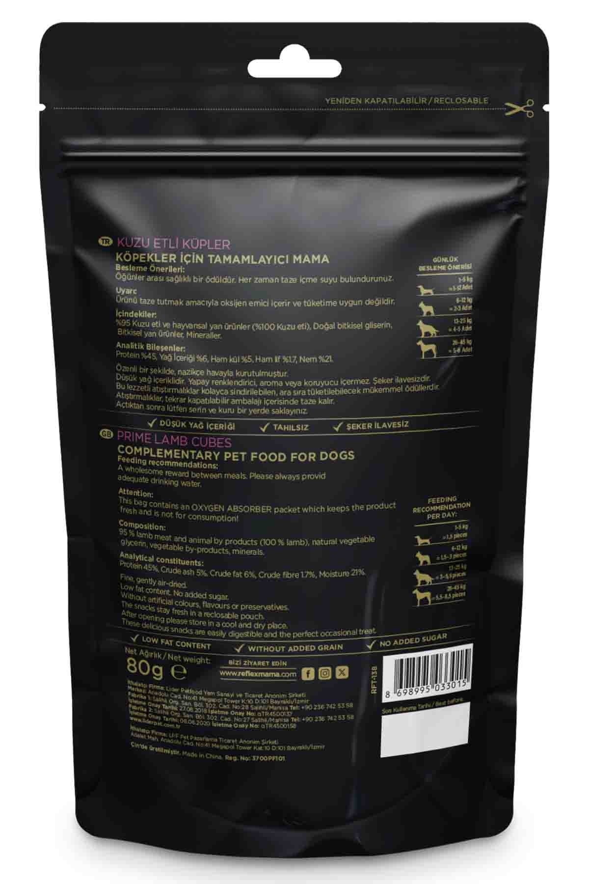 Reflex sanackies kuzu etli küpler köpek ödül maması; Köpekler için özel olarak formüle edilmiştir. Köpek ödül maması; Öğünler arası sağlıklı tamamlayıcı mamadır. Her zaman taze içme suyu bulundurulması önerilmektedir. Yağ oranı düşük olarak üretilmiştir. Yapay renklendirici, aroma verici ve koruyucu içermez. Köpek ödülü; Kolay sindirilebilirlik özelliğine sahiptir.