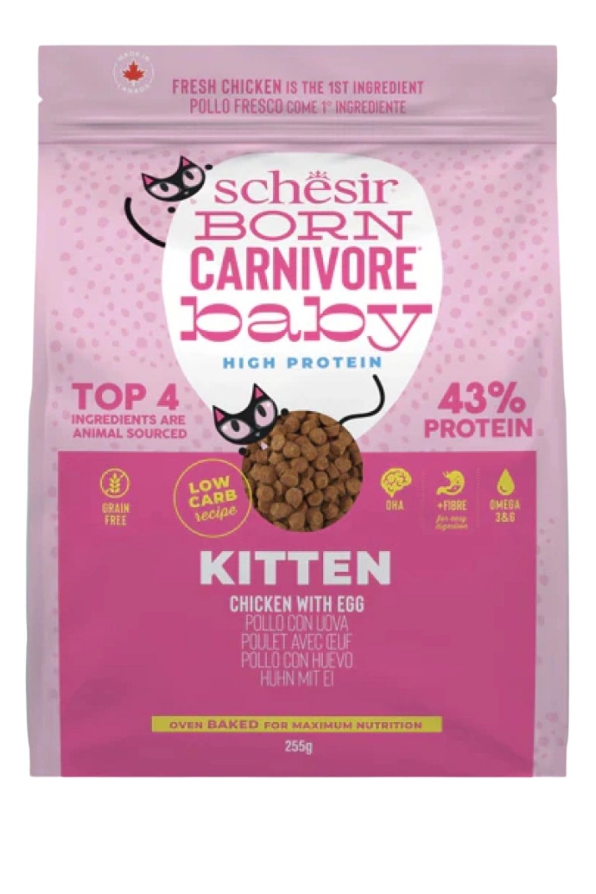 Schesir born carnivore baby tavuklu ve yumurtalı yavru kedi maması; Yavru kediler için özel olarak formüle edilmiştir. Taze tavuk eti kullanılarak üretilmştir. Yavru kedi maması; Tahıl içermez. İçeriğinde bulunan probiyotik sindirim sistemini desteklemektedir. Kedi maması; Büyüme çağındaki yavru kedilerin gelişimin desteklemektedir. Yüksek protein ve düşük karbonhidrat bulunmaktadır.