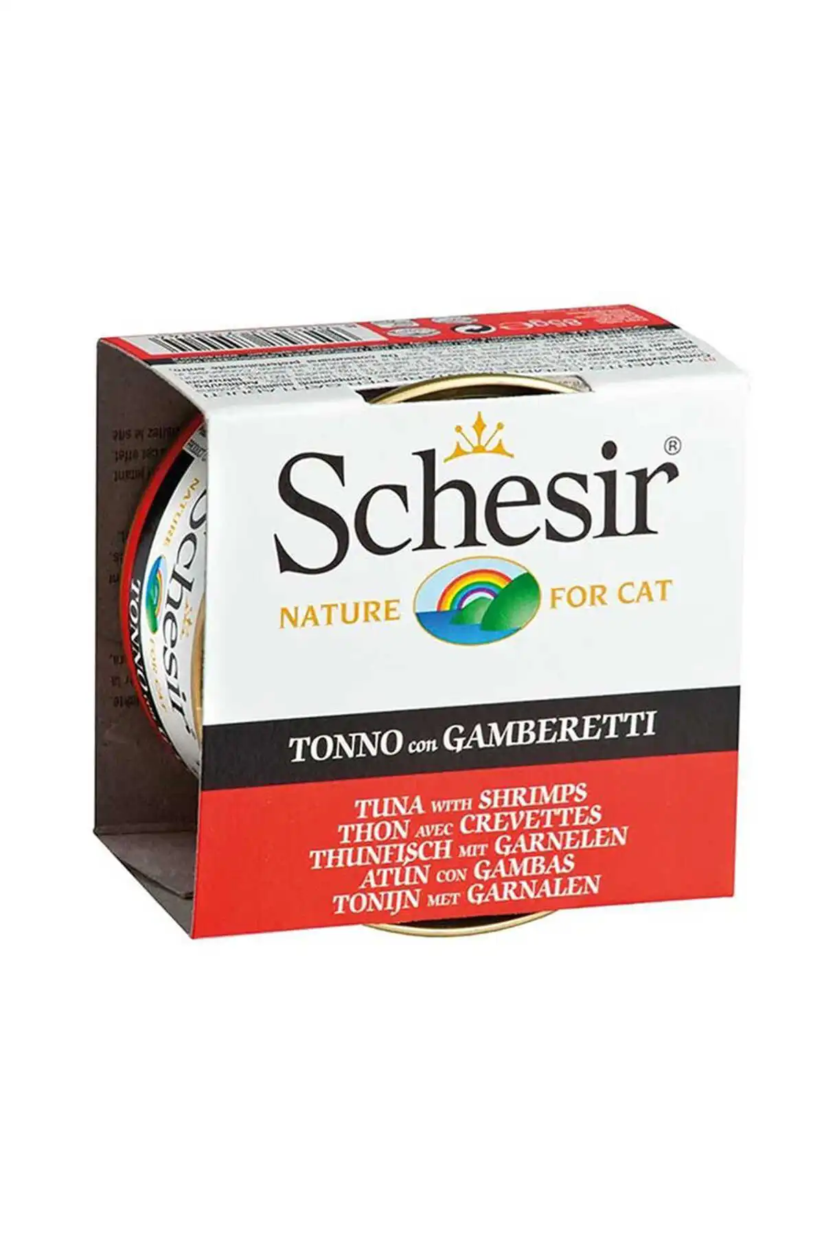 Schesir yaş mama, yetişkin kedilerin günlük beslenmesi için, besleyici ve sağlıklı, ton balığı ve karides içeren konserve kedi mamasıdır.