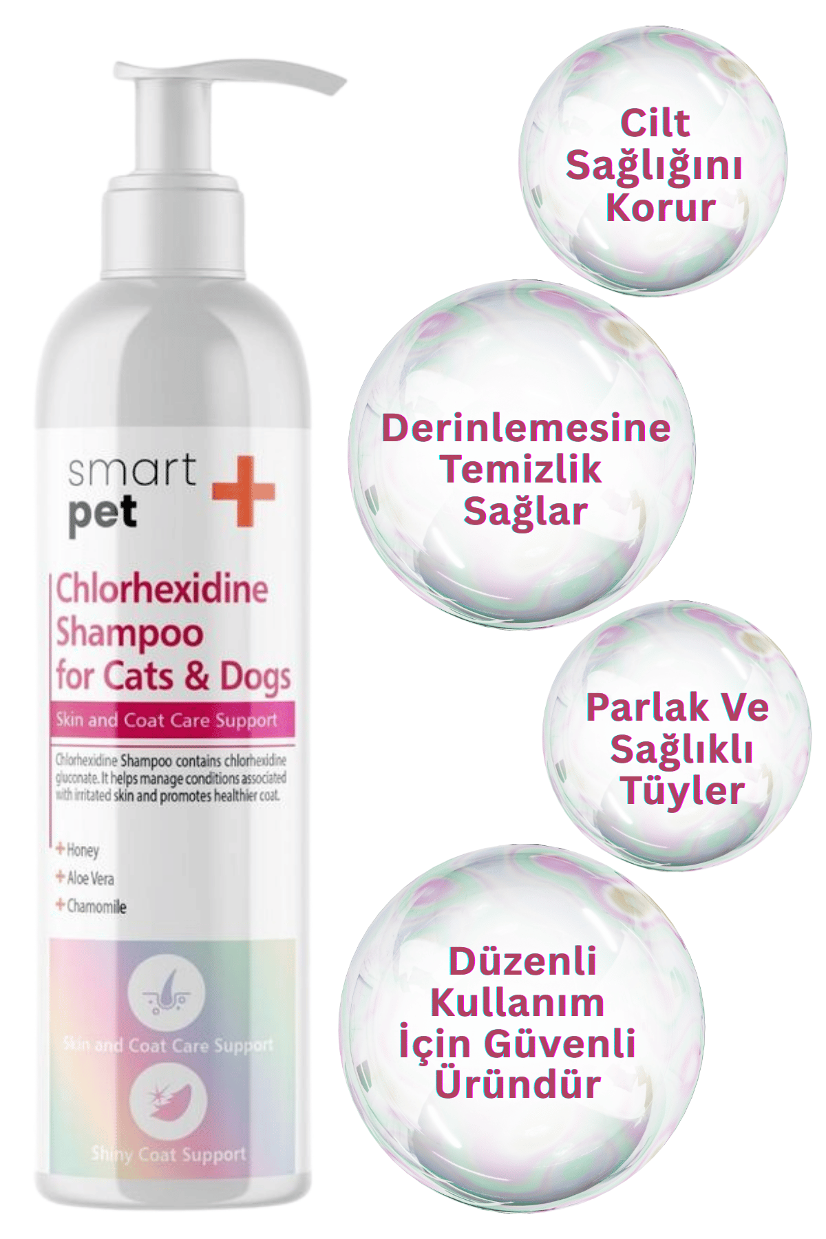 Smartpet + clorhexine kedi ve köpekler için şampuan; Kedi ve köpekler için özel olarak formüle edilmiştir. Kedi ve Köpekler için Klorheksidinli Şampuan; Klorhegsidin glukonat koruyucu özelliklere sahiptir. Koruyucu ve temizleyici özellikleri cilt sorunlarını yönetmeye yardımcı olur. çindeki bitkisel ekstratlar ile tüyleri onarır, kürke parlaklık vererek daha sağlıklı görünmesini sağlar.