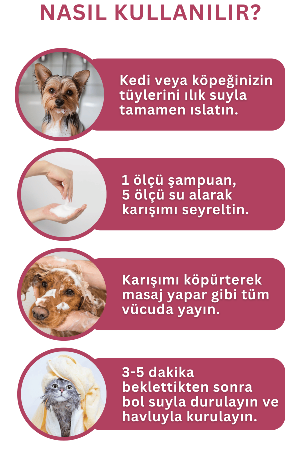 Kedi ve köpeklerde temizlik amacı ile kullanılır. Uygulama Şekli ve Dozu: Uygulama için önce kedi/köpeğin vücudu ılık suyla ıslatılır. Kullanılacak miktar 5 katı suda seyreltildikten sonra ovularak köpüğün tüm vücuda yayılması sağlanır. Hayvan 3 - 5 dakika köpüklü olarak tutulduktan sonra yıkanır ve havluyla kurulanır.