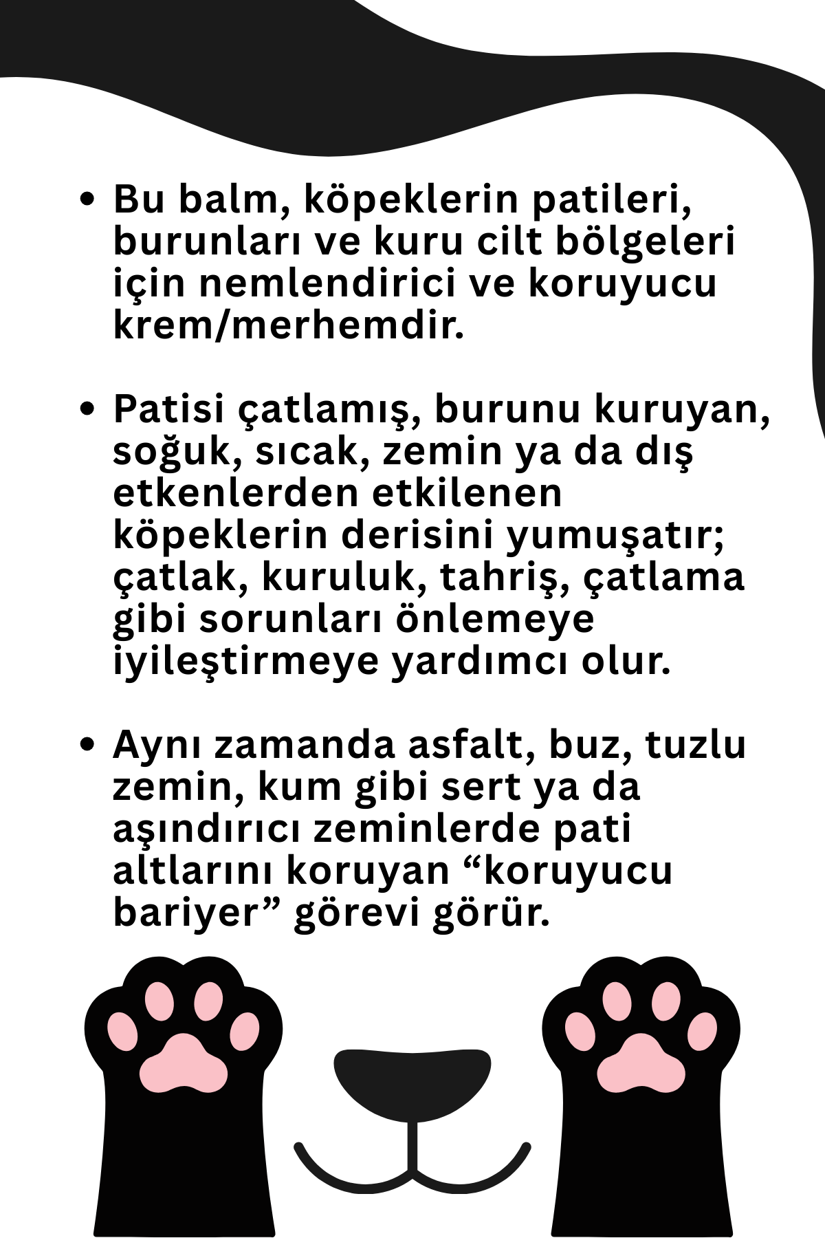 SmartPet + Köpekler için Pati ve Burun Bakım Kremi 50ml; sevimli dostlarınızın dış etkenlere en çok maruz kalan bölgeleri olan pati ve burun dokusunu korumak için geliştirilmiş, onarıcı etkili bir köpek bakım ürünüdür. Sıcak asfalt, buz, kar veya engebeli arazilerin neden olduğu kuruma, sertleşme ve çatlamalara karşı cildi derinlemesine nemlendirerek yumuşatır. Oluşturduğu koruyucu bariyer sayesinde yeni tahrişlerin oluşumunu engellemeye yardımcı olur. Tamamen doğal içeriklerle formüle edilen bu köpek pati bakım kremi, yalanması durumunda dostunuza zarar vermeyen güvenli yapısıyla dört mevsim boyunca sağlıklı ve yumuşak patiler sunar.