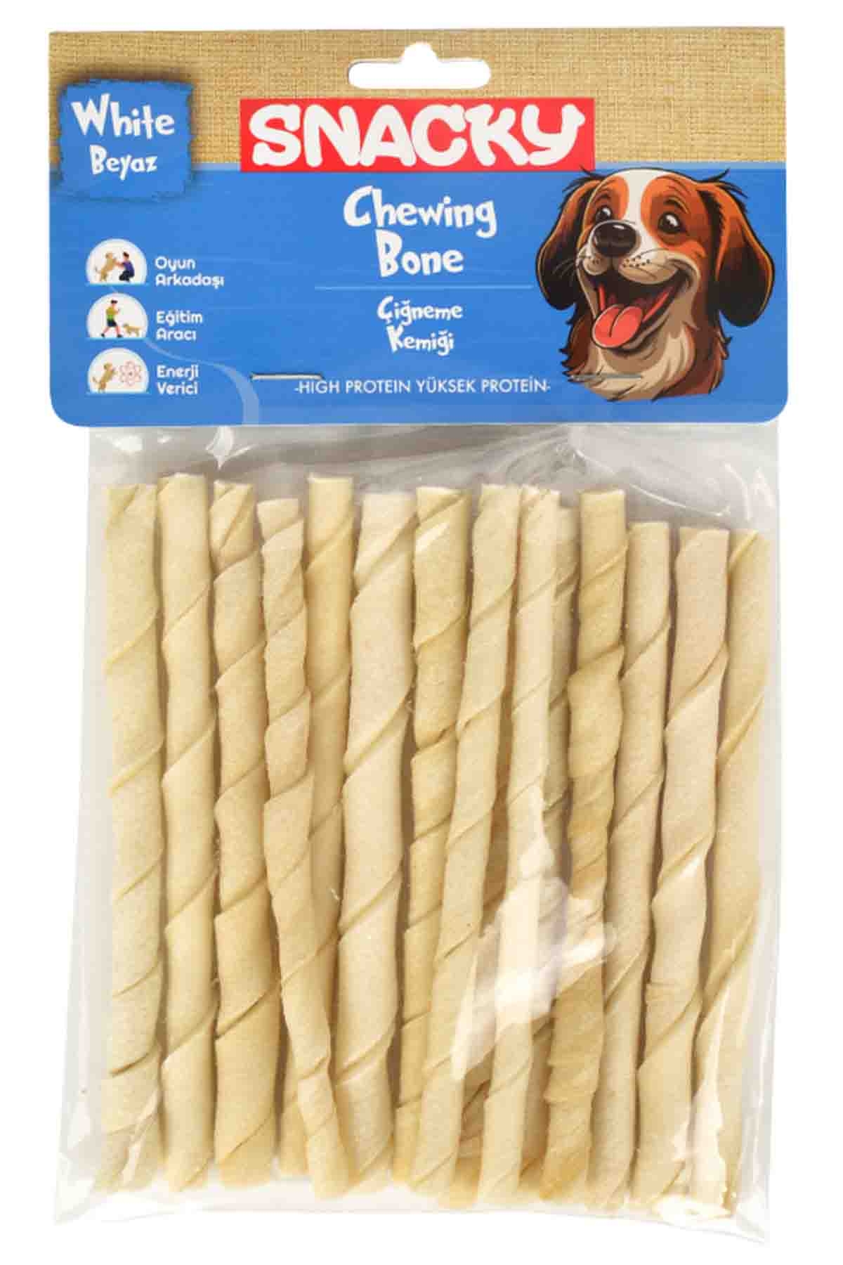 Snacky beyaz köpek burgu çubuk; Köpekler için özel olarak formüle edilmiştir. Çiğneme kemiği; Protein oranı yüksek, yağ oranı düşük olarak üretilmiştir. %100 ham deri kullanılarak hazırlanan lezzetli atıştırmalıktır. Ödül maması; Köpeğinizin ağız ve diş sağlığının korunmasına destek vermektedir. Çene kemiklerinin güçlenmesini sağlamaktadır. Paket içerisinde 15 adet 13 cm uzunluğunda kemik bulunmaktadır.