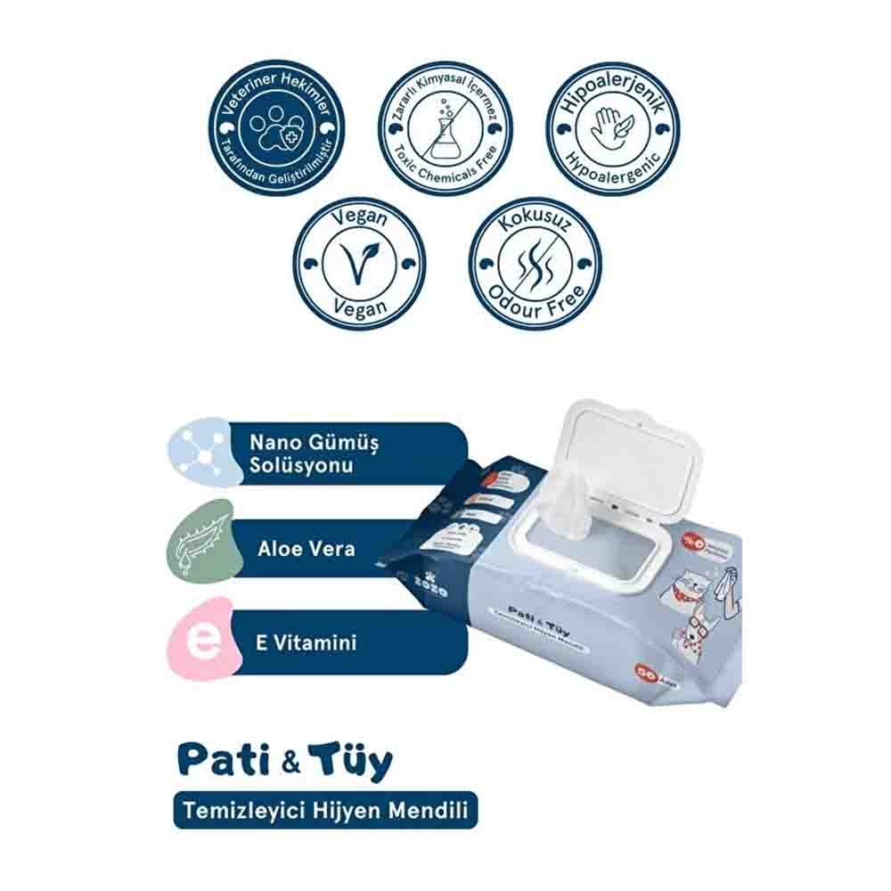 Zozo cares tüy ve pati temizleme mendili; Kedi ve köpekler için özel olarak formüle edilmiştir. Günlük kullanım için uygundur. Temizleme mendili; Kedi ve köpeğinizin göz ve kulak haricinde tüm vücuduna uygulayabilirsiniz. Suya ve sabuna ihtiyaç duymadan evcil hayvanlarınızın pati ve tüylerinin temizlenmesine yardımcı olmaktadır. Tüy ve pati temizleme mendili; Durulama gerektirmez. Alkol, paraben, sülfat, Sles, sls, silikon, fosfat, amonyak, boya ve sentetik yağ içermez. Paket içinde 50 adet mendil bulunmaktadır.